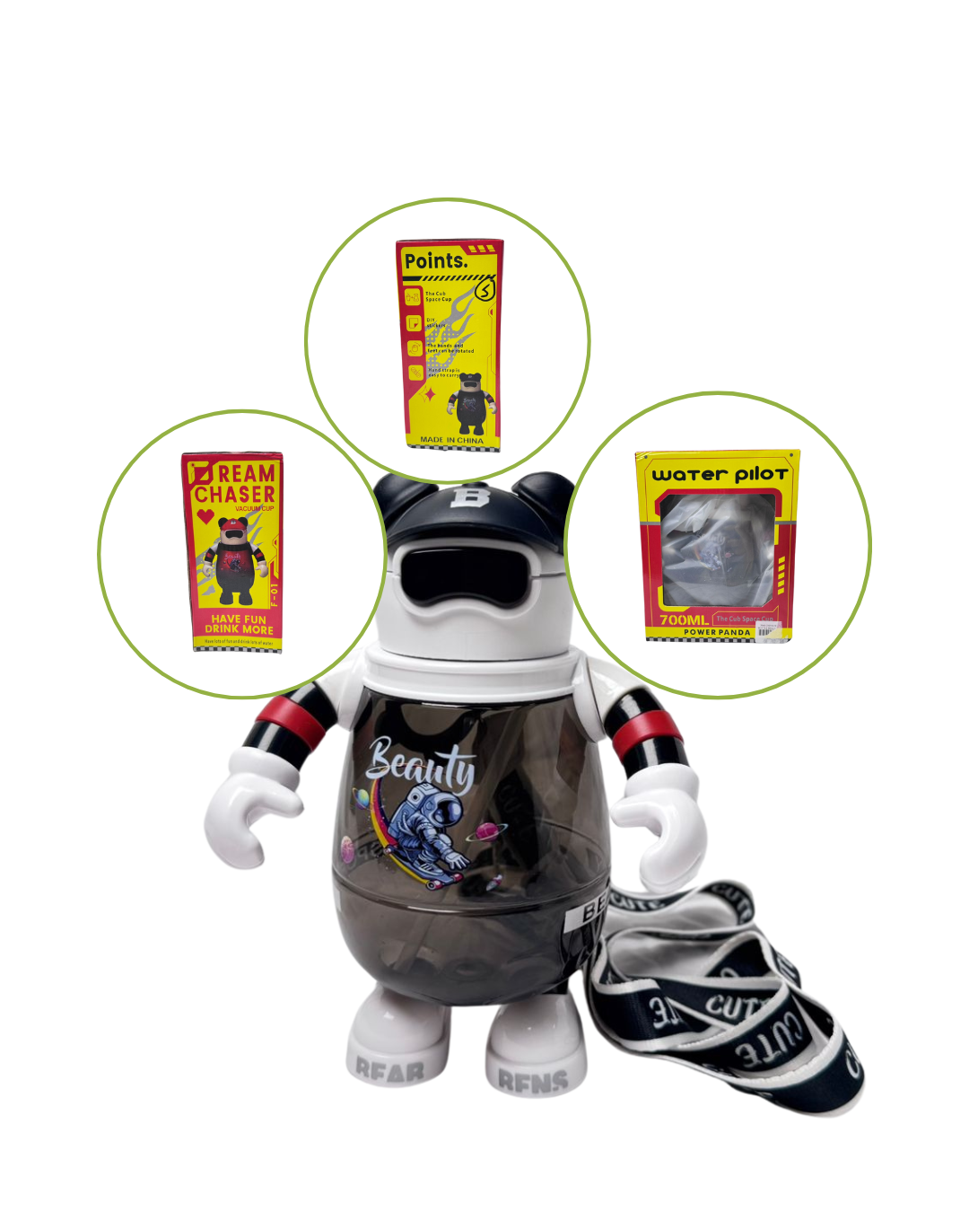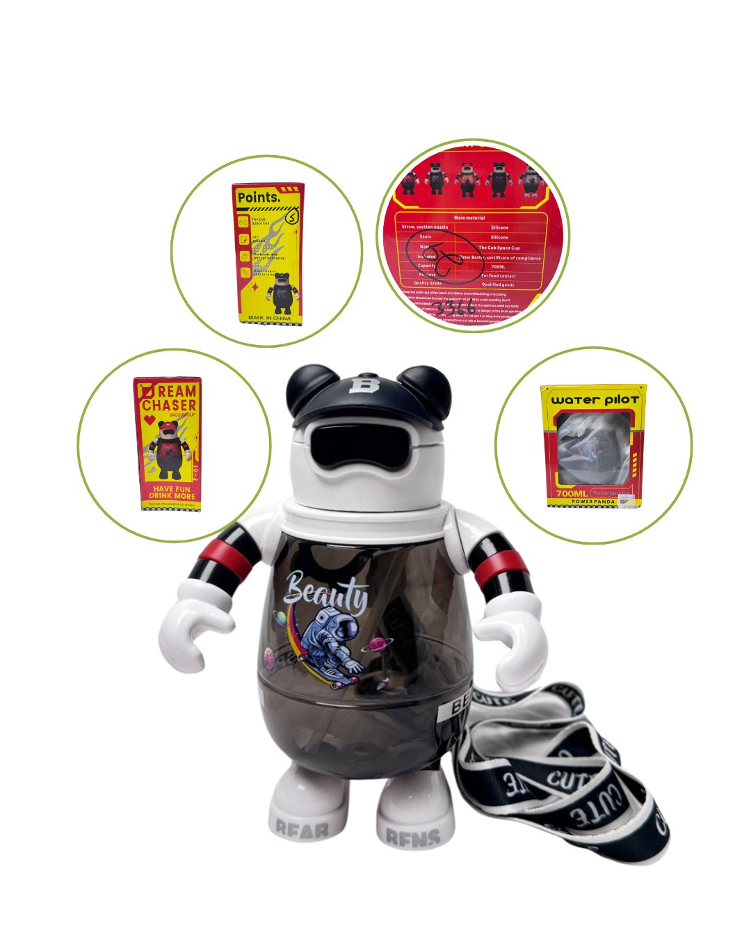 Kids' Water bottle graphic style and bear-shaped with moveable arms and a silicone mouthpiece.